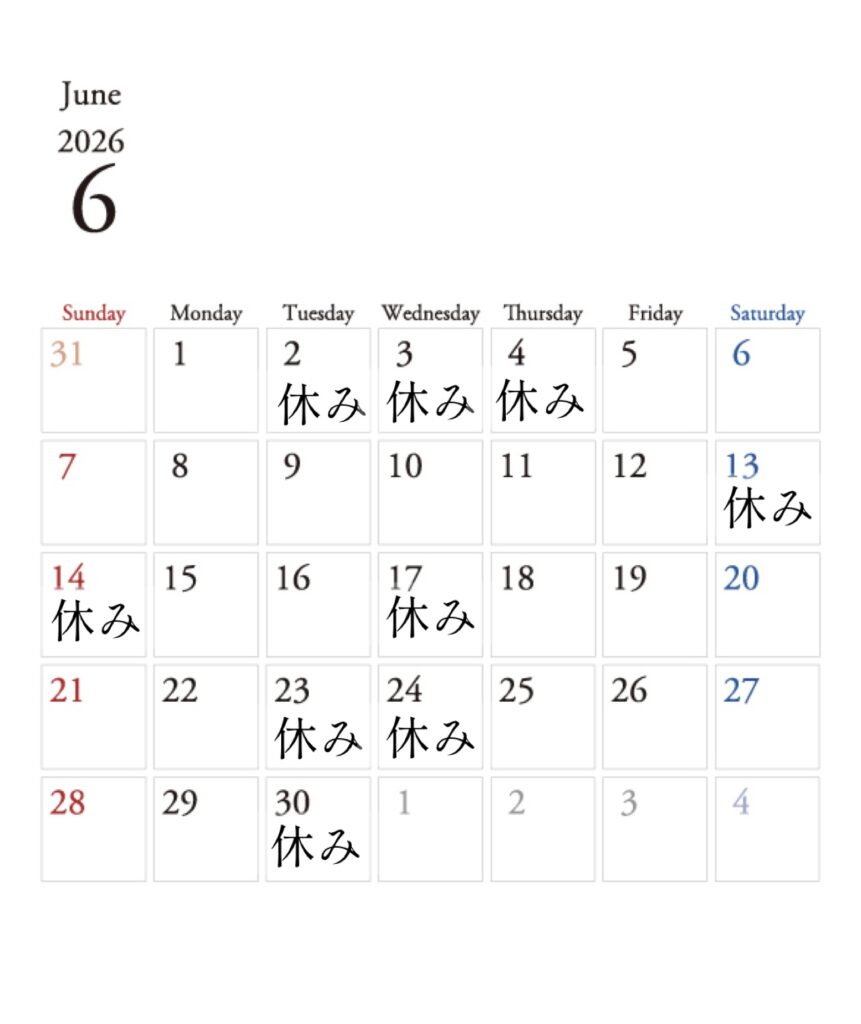 2026年 6月 営業日カレンダー